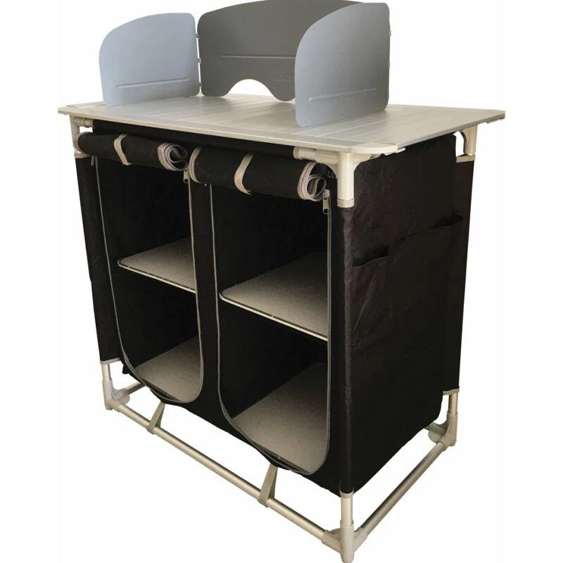 Meuble de cuisine avec quatre espaces de rangement pour vos ustensiles de cuisine, des petites poches latérales et un plan de travail équipé d’un pare-flamme.